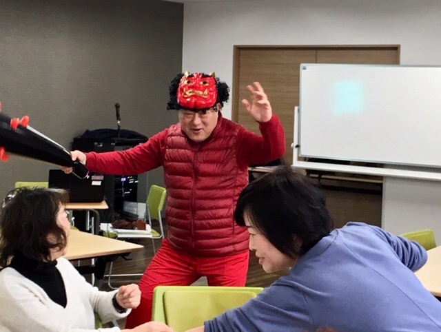 節分が近いということで豆まきも体験。これで邪気を払って無病息災ですね!!