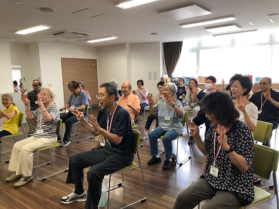 イスに座ったまま、お尻で座面を進むお尻体操、肩甲骨を寄せながら行う胸の筋肉をきたえる体操、あばらを広げる運動などつなげて曲に合わせ動かします。