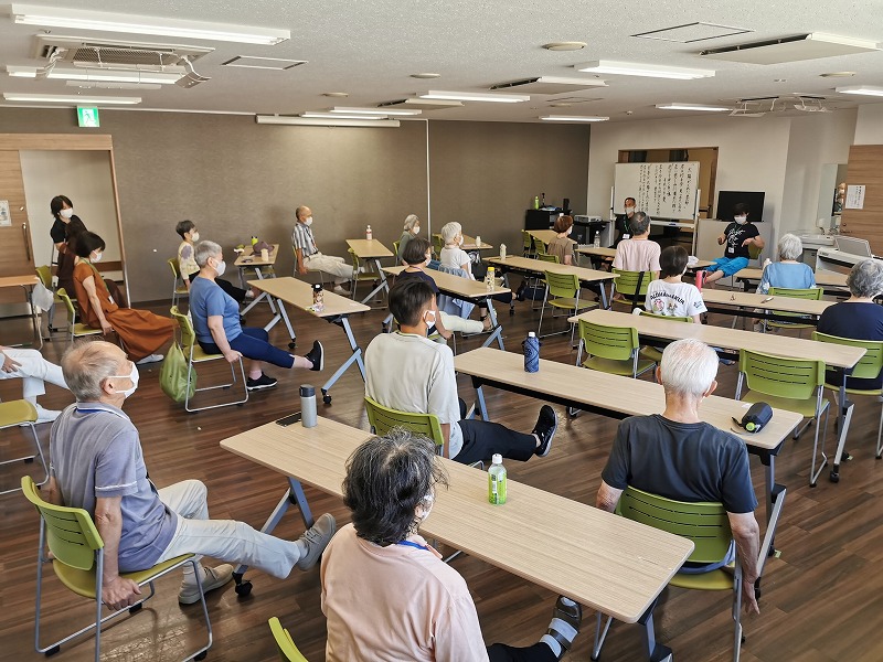 事務局のあいさつやお知らせが終わると、早速運動が始まります。「頭と体の体操」と題して、身体を動かしながら、100から7を順番に引いて行ったり、夏といえば◯◯というお題が出たり、頭と体を同時に動かしていきました。