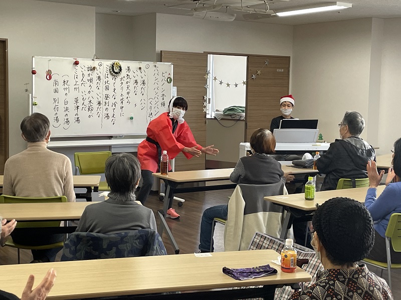 音楽のコーナーも一足早く『ドリフのビバノン音頭』で年末を意識しながら曲に乗ってそれぞれひょうきんなダンスを披露してくれました。また、青柳先生のクリスマスリサイタルも開催。おなじみのクリスマスソングに聞き入りながら温かいカルピスに癒されながら雰囲気たっぷりの時間を過ごすことができました。