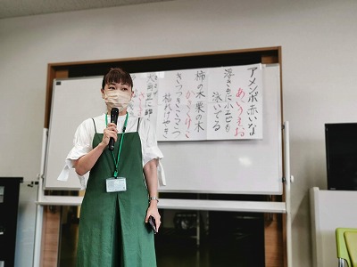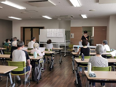 はじめに、活舌の練習から。「ま・み・む・め・も」など一文字ずつ口をしっかり動かして嚥下(えんげ)体操を行いました。自宅で毎日5分間続けることで、誤嚥(ごえん)予防になるそうです。ぜひ、続けてみてください。