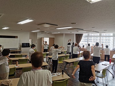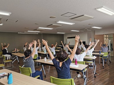 真夏の暑さもようやく和らいできて、朝晩が涼しくなりました。曇りときどき小雨という天候の中、19名のみなさまと一緒に体操を楽しみました。