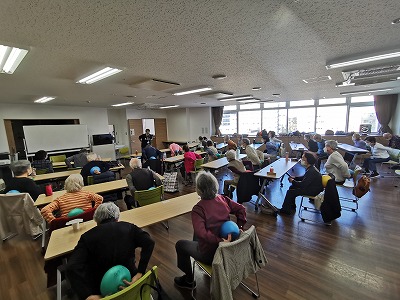 「転倒予防教室のみなさまは、ずっと続けておられるだけに、しっ かりと足が動いていました。反応も速く脳トレもバッチリ。片足立ち運動では手を椅子から離されていらっしゃる方もいて、本当にお元気でパワフルでした」