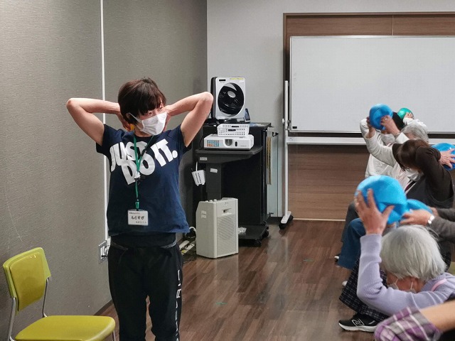 本杉ひとみトレーナーによる脳と体の運動では、ボールを使った運動や短時間でできる有酸素運動、通称「のれんスクワット」と言われる下半身の筋トレなどさまざまな運動を行った後、ストレッチで使った筋肉をほぐしてレッスンを終了しました。