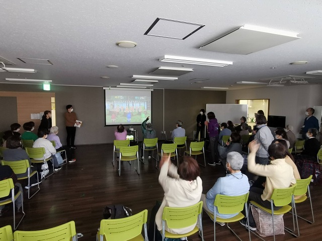 チーム対抗戦の運動ゲームでは、画面に合わせた体の動きでポイントを競い合いました。速い動きだけが高得点ではなく、確実な動きも重要なようでした。見守るチームメンバーからは「がんばれ~」の声援が飛んで、盛り上がっていました。