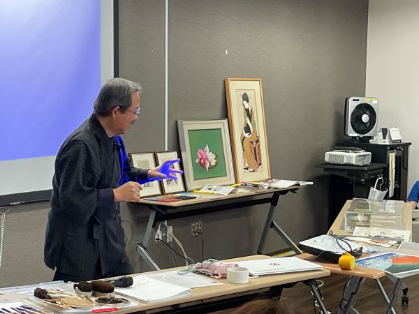 今日は伝統工芸士としても活躍中の浮世絵版画師、朝香元春さんの登場です。作品を見せていただくと主に、どのように昔の版画を彫り師、塗師として再現するのかその手順を解説動画や実際の道具なども見せていただきながら講演いただきました。