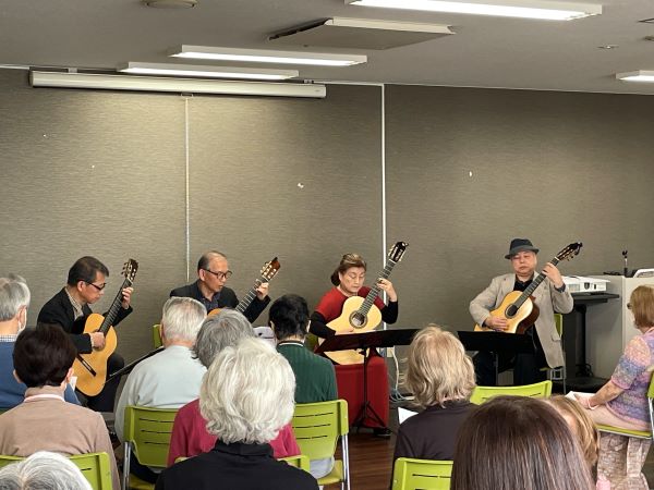 第2部は、もみの木ギターサークルの皆さんにお越しいただきました。今回の曲目はおなじみの曲ばかりで皆さん、体をゆすったり口ずさんだりしながら興味津々に聞き入っていらっしゃいました。懐かしの映画曲やオペラ曲など様々な分野からの厳選された曲ばかりでした。