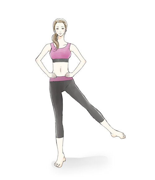 - まっすぐ立ち、手を腰に当てます。バランスが不安定な場合は、壁に手をついても構いません。